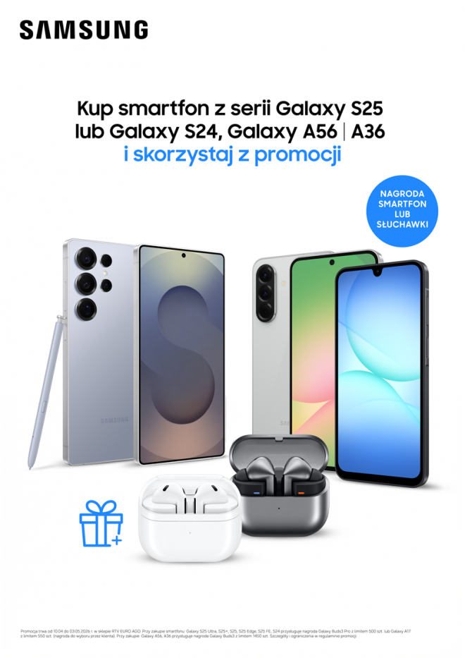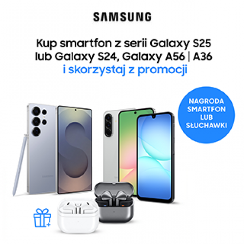 ***Nagrodą za zakup modelu Galaxy S25, S25+, S25 Ultra, S25 Edge, S25 FE, S24 jest smartfon Galaxy Galaxy A17 w kolorze czarnym (SM-A175FZKBEUE, limit: 550 sztuk) lub Galaxy Buds3 Pro (SM-R630NZAAEUE, limit: 500 sztuk), a nagrodą za zakup modelu Galaxy A56, A36 są słuchawki Galaxy Buds3 (SM-R530NZAAEUE, limit: 1450 sztuk). Szczegóły i ograniczenia w regulaminie poniżej.