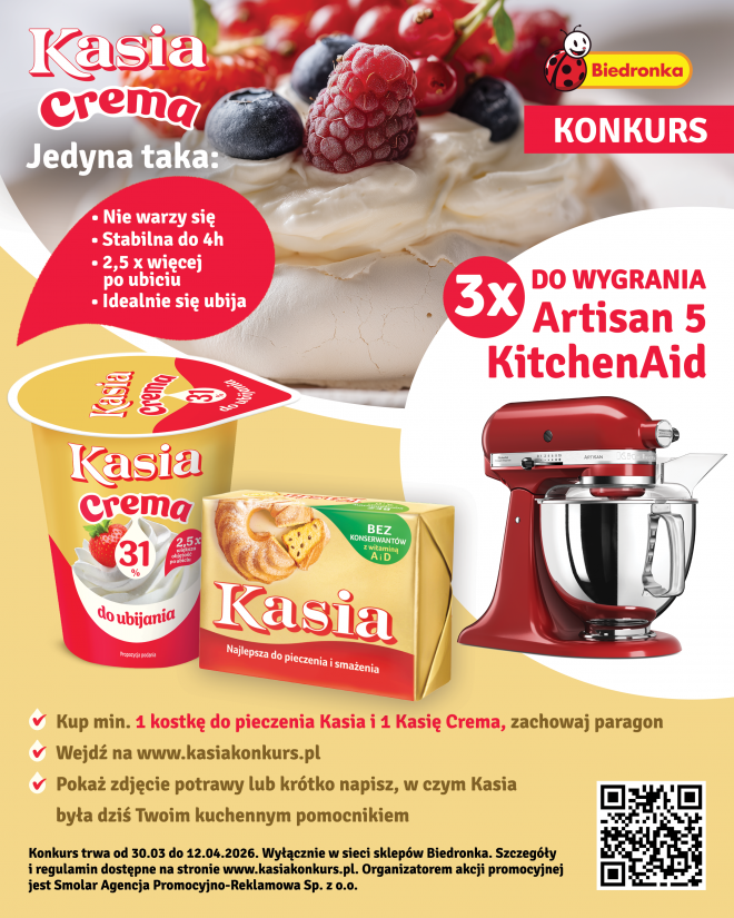 – dokonaj łącznego zakupu dwóch następujących produktów marki Kasia: 1 kostki do pieczenia Kasia i 1 Kasi Creme w sklepach sieci Biedronka w dniach od 30.03.2026 r. do 12.04.2026 r.