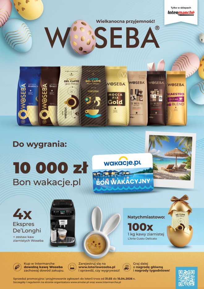 31.03.2026 r. wystartowała loteria "WOSEBA - wielkanocna PRZYJEMNOSĆ!" w sieci Intermarche. Do udziału wystarczy zakup dowolnej kawy Woseba w sklepie promocyjnym, a następnie rejestracja paragonu na stronie loteriawoseba.pl.