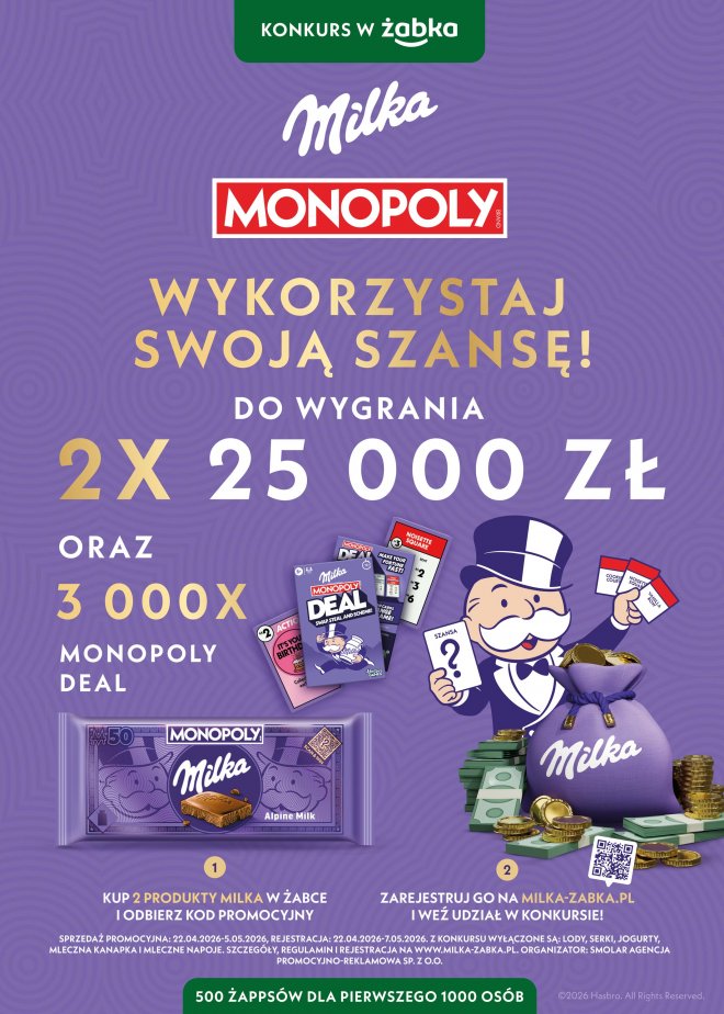 22.04.2026 r. wystartował konkurs "Milka Monopoly w Żabce". Warunkiem udziału w akcji jest zakup 2 produktów Milka* z aplikacją Żappka, pobranie z aplikacji kodu promocyjnego i rejestracja go w formularzu zgłoszeniowym na milka-zabka.pl. Spośród odpowiedzi na pytanie "dokąd pojedziesz w podróż z Milką?" jury konkursowe wybierze laureatów poniższych nagród: