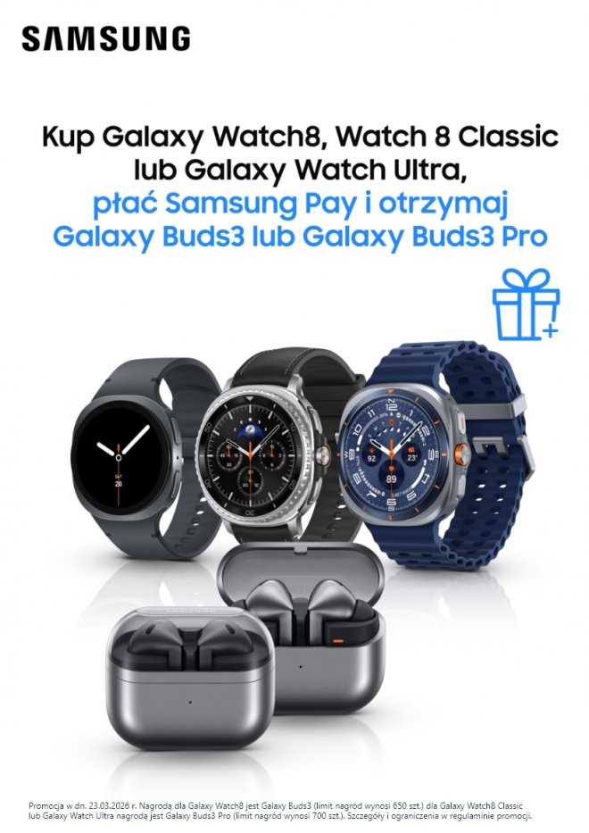 ***Nagrodą za zakup Samsung Galaxy Watch Ultra oraz Samsung Galaxy Watch8 Classic są słuchawki Galaxy Buds3 Pro (SM- R630NZAAEUE z limitem 700 sztuk), a nagrodą za zakup Samsung Galaxy Watch8 są słuchawki Galaxy Buds3 (SM-R530NZAAEUE z limitem 650 sztuk). Szczegóły i ograniczenia w regulaminie poniżej.